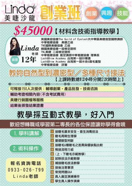 可稼接150人次提供:輔導創業,產品批發,技術咨詢,輔助考證相關內容(不含考試費用),美睫行銷圖檔等服務。結業後頒發結業證書。敎學採互動式敎學,好入門。歡迎想轉職或學習第二專長的各位保證讓妳學得會哦~1.學科講解2.術科操作
